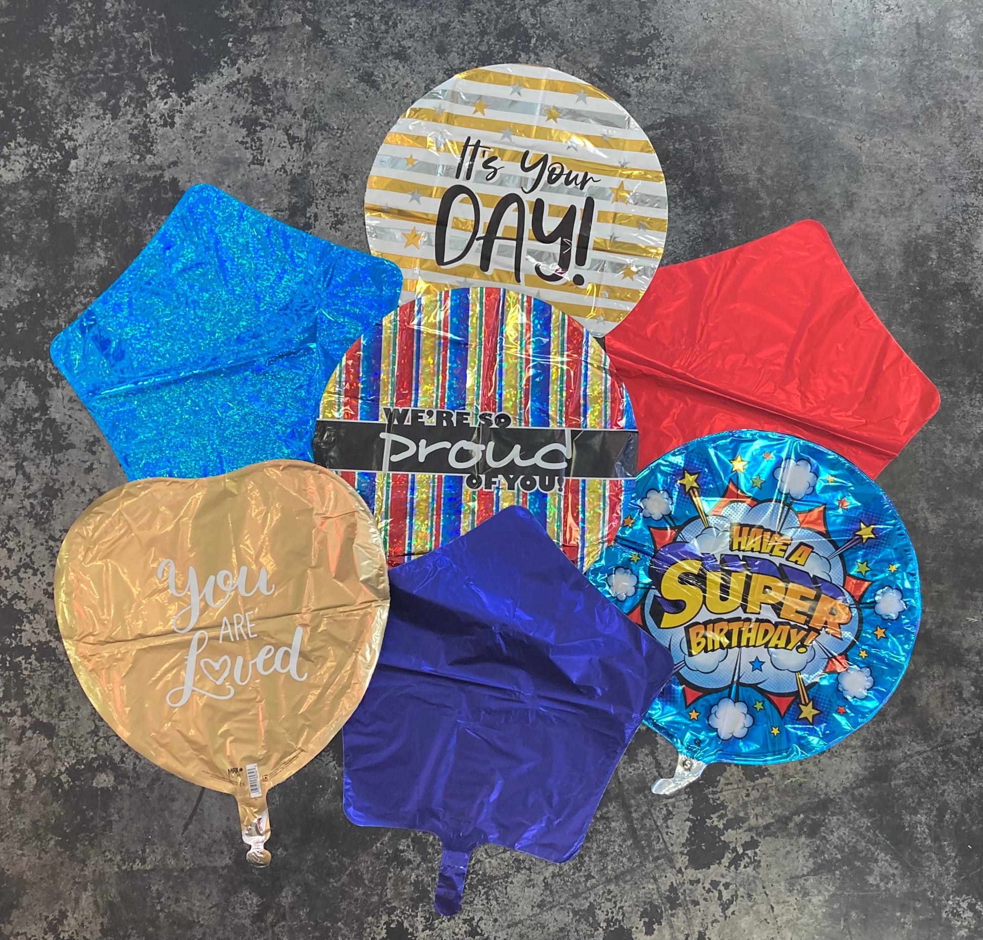 Seven (7) assorted standard size themed mylar balloons on a weight. Better: 9 balloons, Best: 12 balloons