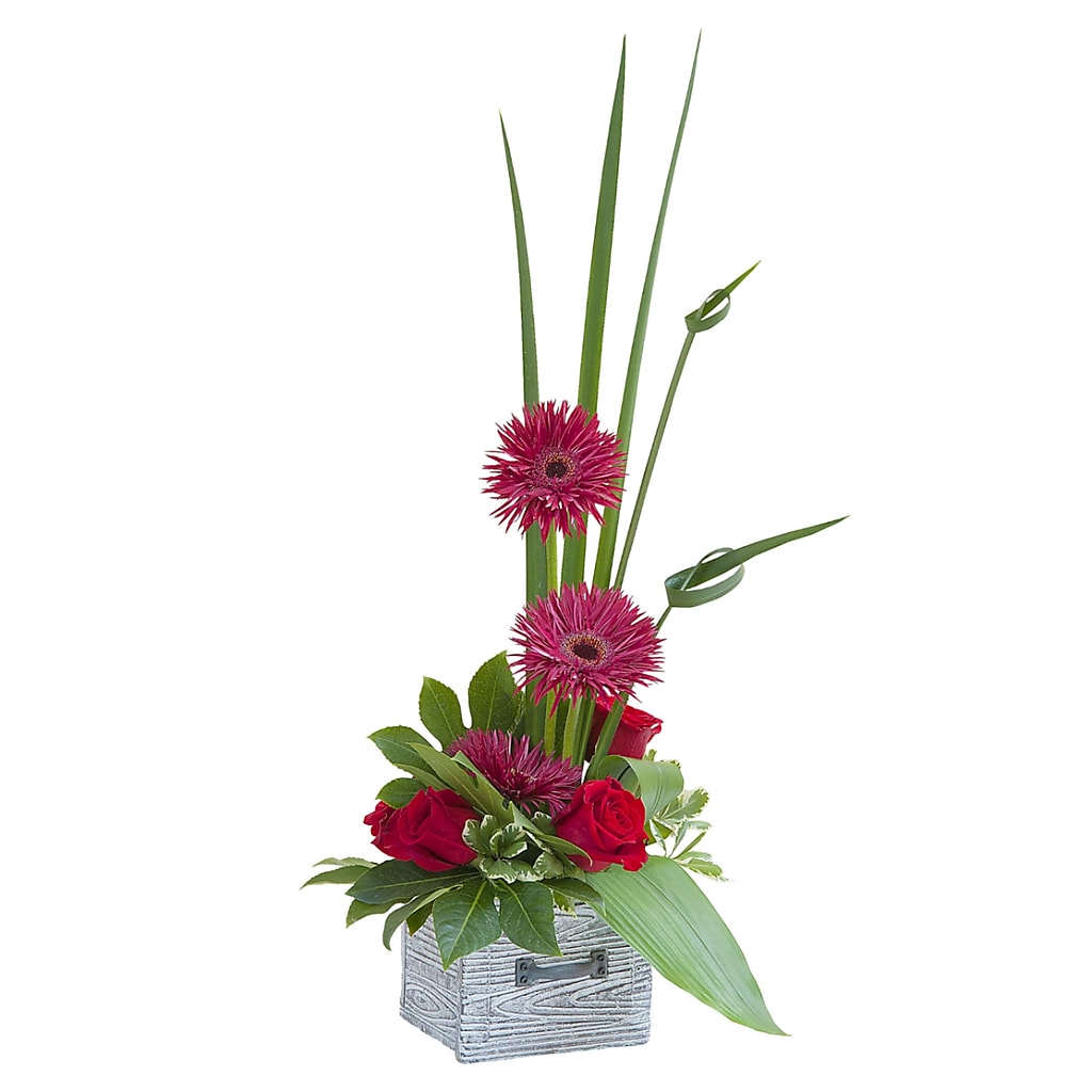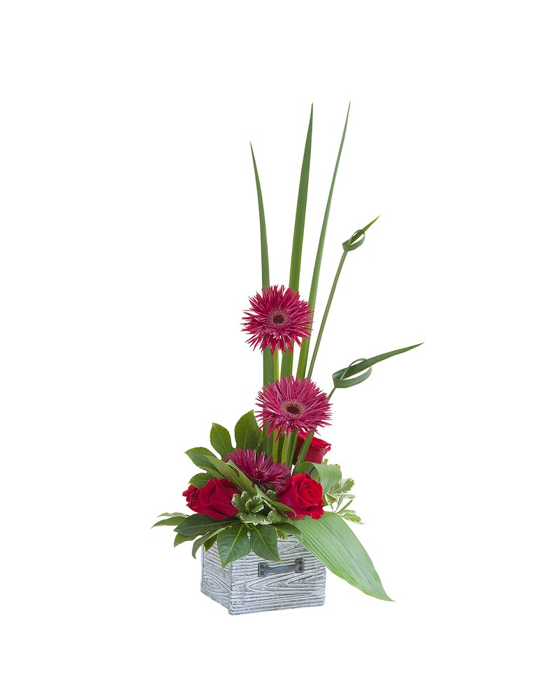 Roses and Gerbera fill this drawer of memories with a stylized design.