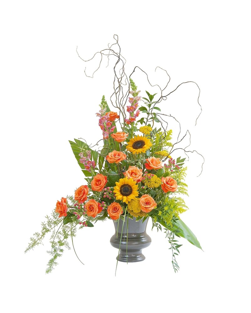 The colors of sunset are evident in this urn filled with Sunflowers, Roses, and accents of other premium flowers and foliage.