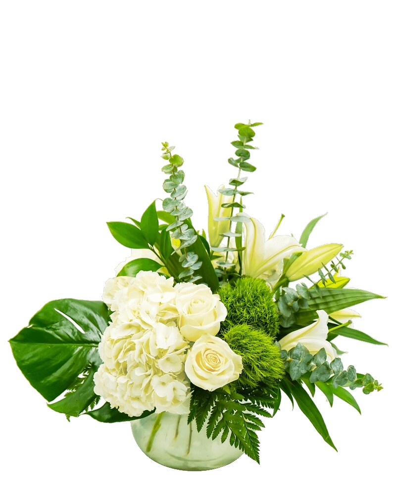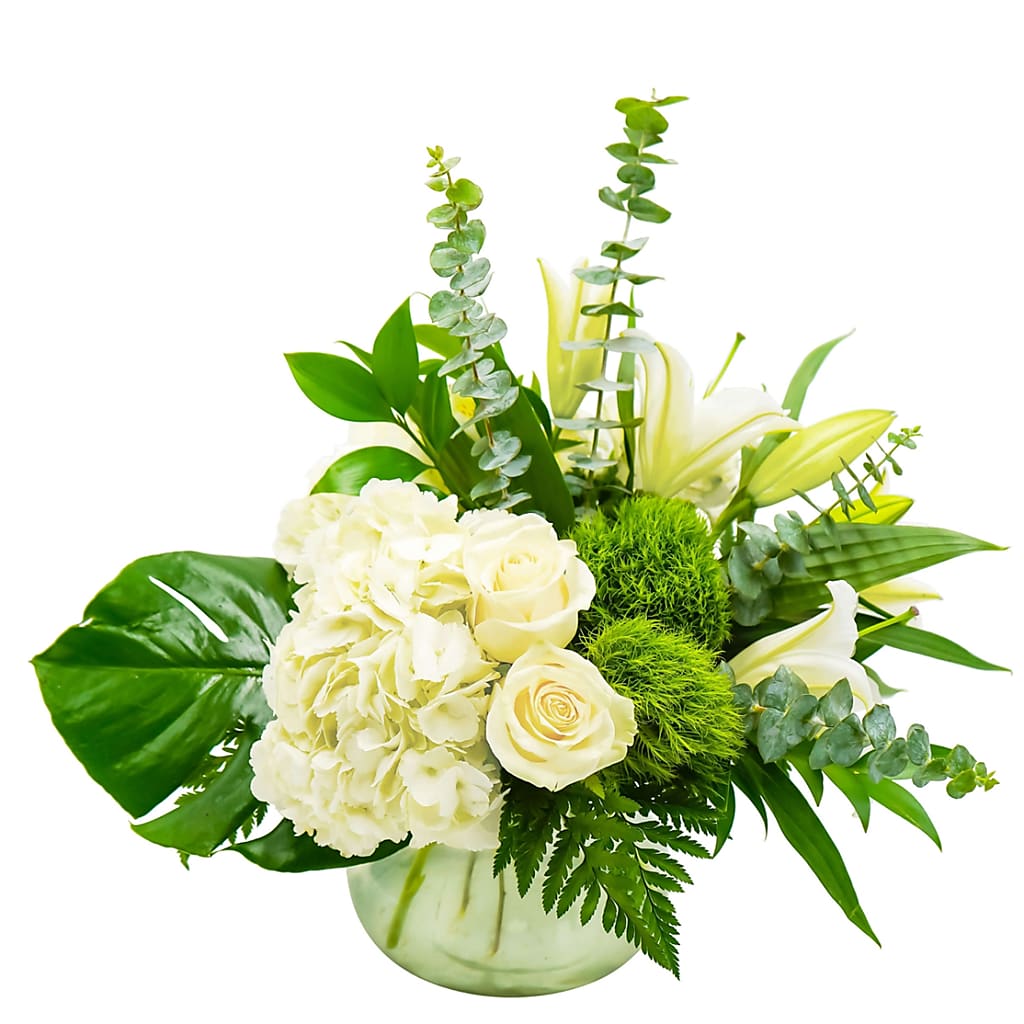 Sincerity is a balance of grace and beauty. White flowers like roses and lilies are the stars of this tasteful bubble arrangement.