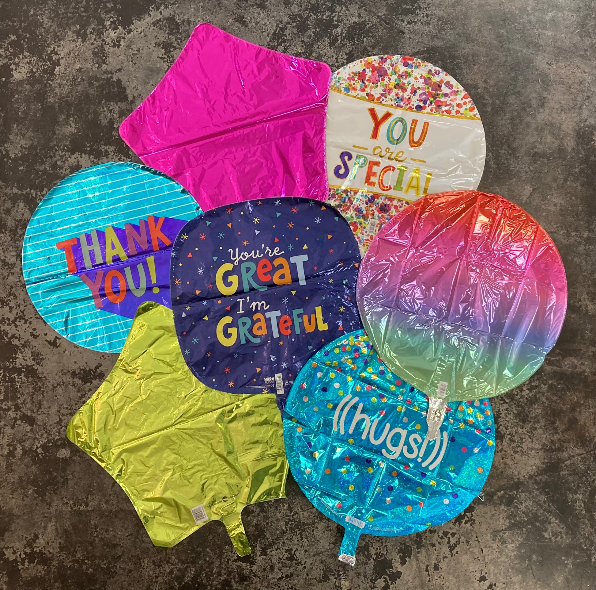 Seven (7) assorted standard size themed mylar balloons on a weight. Better: 9 balloons, Best: 12 balloons