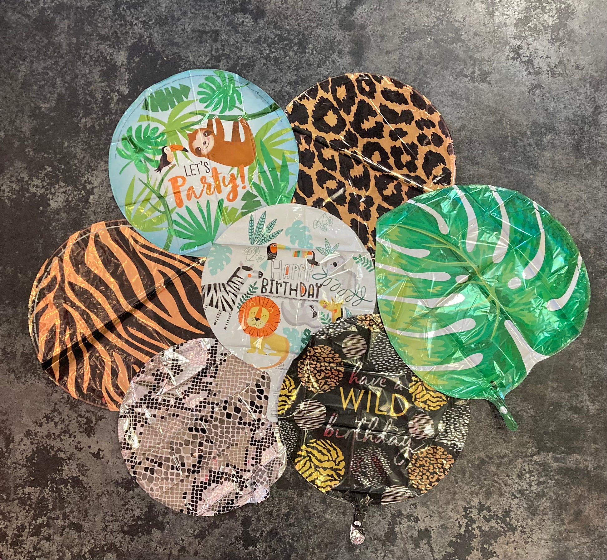 Seven (7) assorted standard size themed mylar balloons on a weight. Better: 9 balloons, Best: 12 balloons