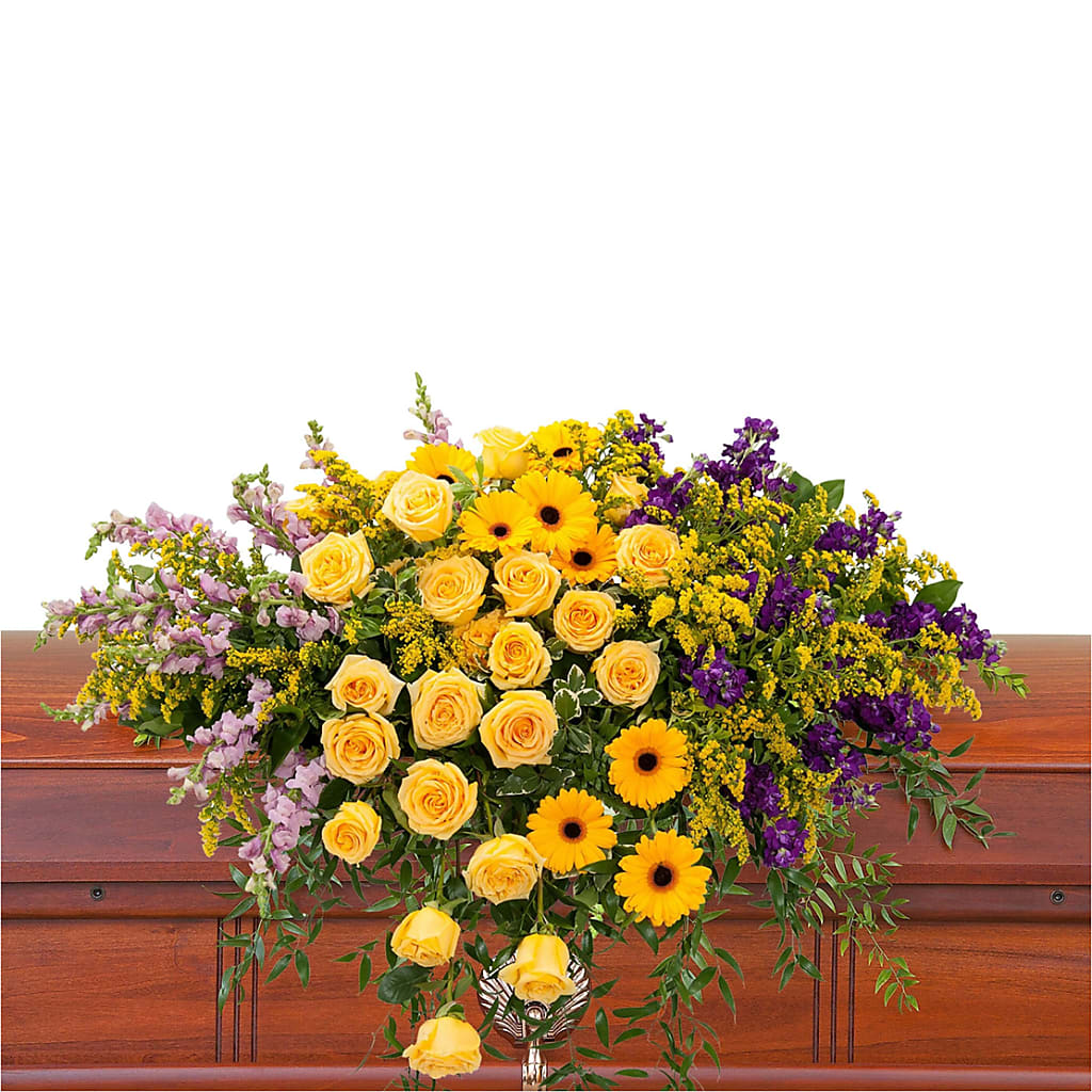 Bright, vivid yellow and purple flowers create a memorable casket spray.